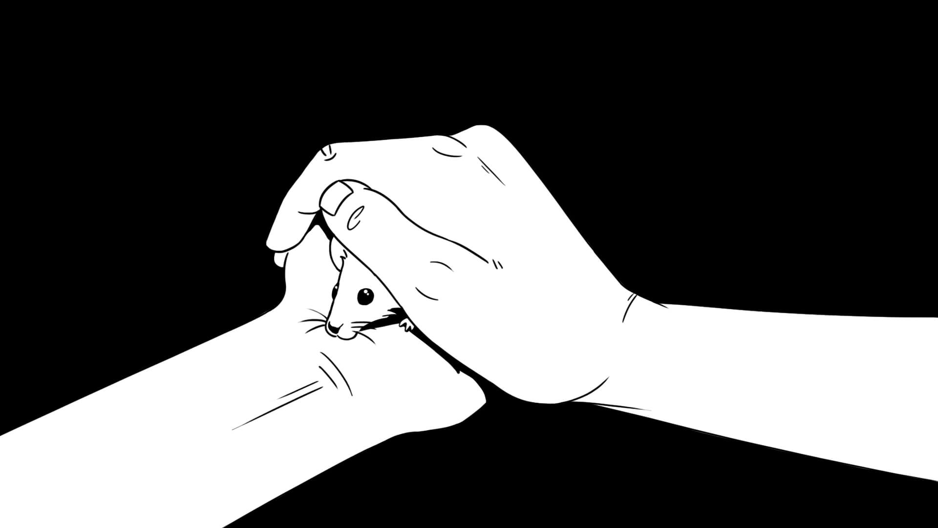 Frame one: We want to start the audience off with a light, happy feeling; the hands protecting and nurturing the mouse as they play together. The music will be quick and light hearted as the mouse scampers around freely, and the voice will be encouraging and supporting it.